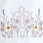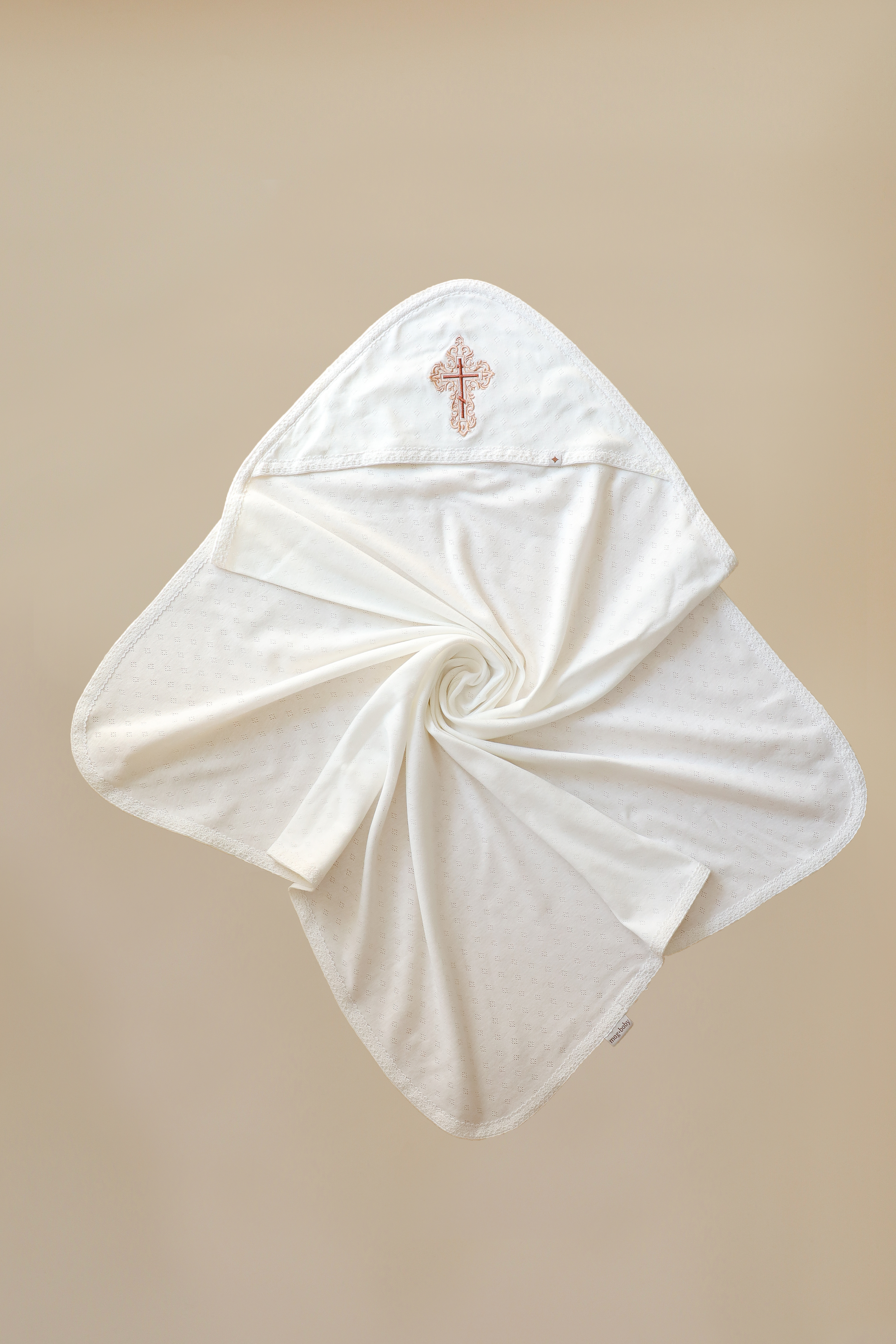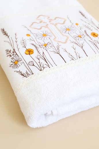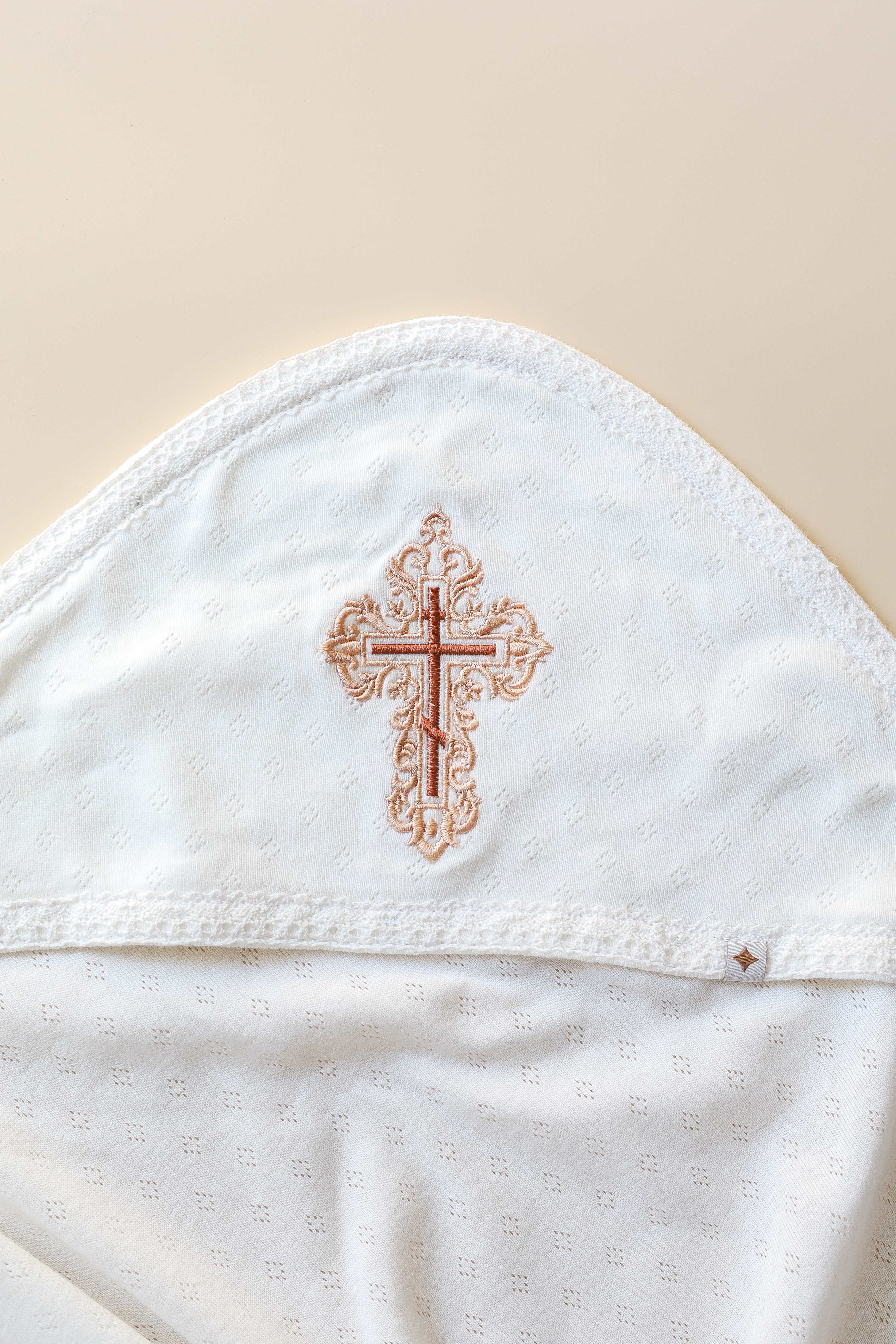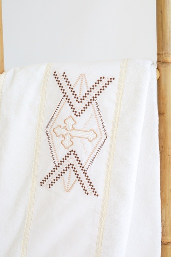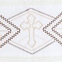 Пошита крыжма в один слой трикотажа и имеет отделку в виде натурального кружева по всему периметру. Изюминкой стал очень красивый крестик с кружевным орнаментом для самых дорогих в этом мире.