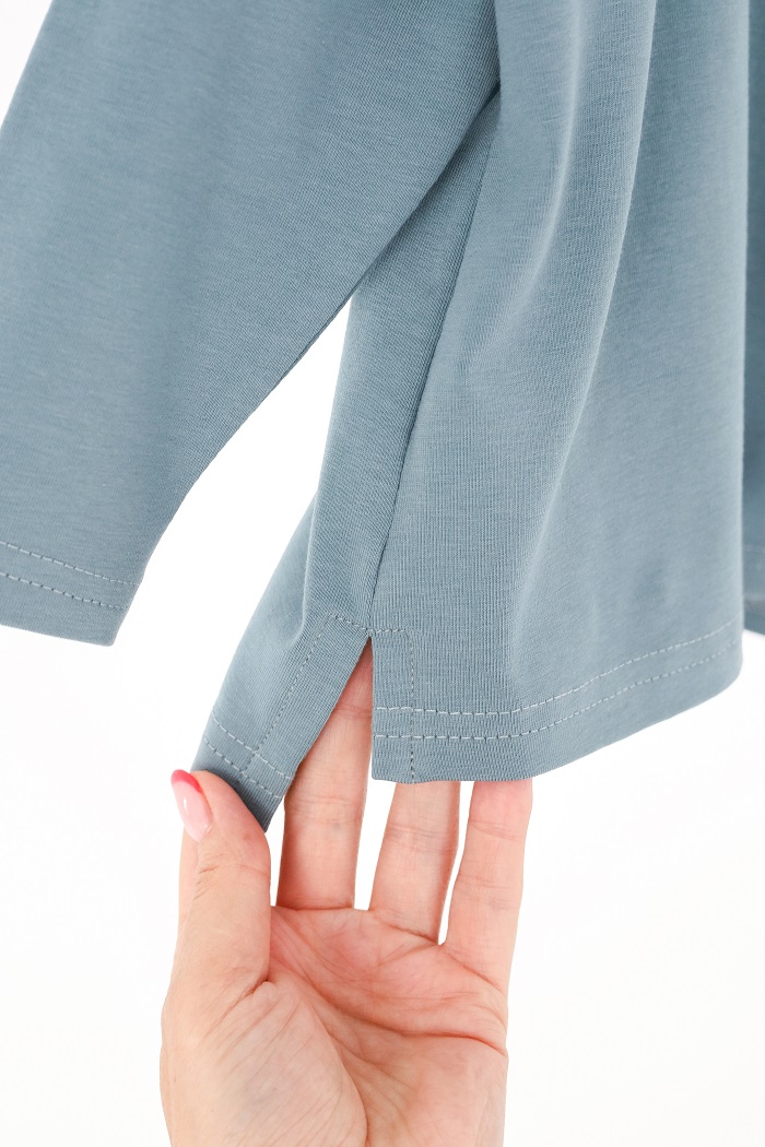 Пошит из трикотажа кулир, натурального хлопка, поэтому очень приятен к телу. Пропускает воздух, отводит влагу и не создает парникового эффекта. А главное — не вызывает аллергию. Тонкий, но не светящийся и хорошо держащий форму.