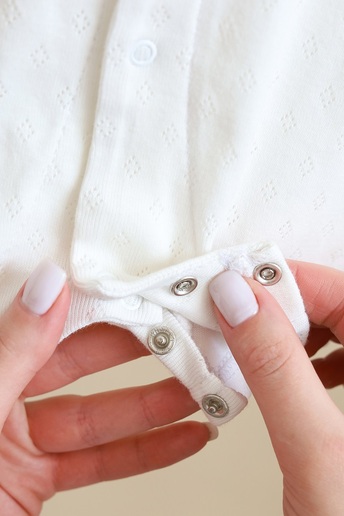 Застегивается на запах, на кнопки сбоку и между ножками. Вся фурнитура без токсичного никеля в составе соответствует нормам ЕС.