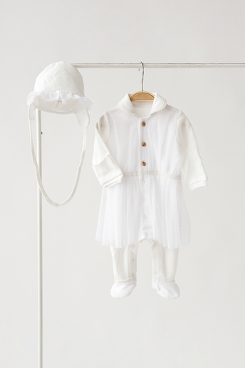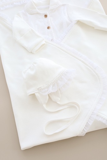 А еще в комплекте есть круто сидящие шапочки, слюнявчик, который позволит не менять мокрую от слюны одежду, царапки и пинетки и красивая подарочная упаковка.
