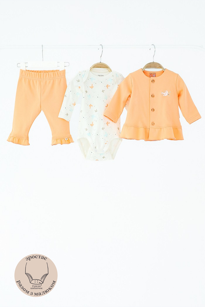 Нежный боди с милым принтом, удобные штанишки с воланами и кофточка со сказочной вышивкой – идеальное сочетание для первых улыбок, объятий и солнечных приключений. В комплект входит: