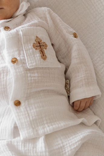- Распашонка с длинным рукавом, на завязках. Впереди вышивка с церковной символикой