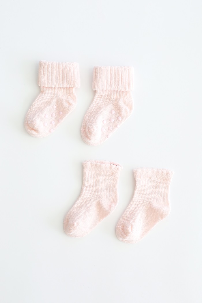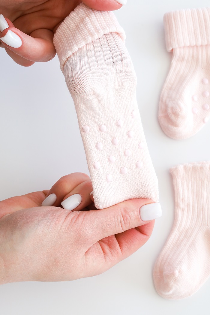 Мы позаботились о силиконовых вставках на стопе для того, чтобы не было скользко на гладком полу, когда малыш начнет вставать и бегать. Поэтому одна пара в комплекте идет со "стопами", а вторая без.
