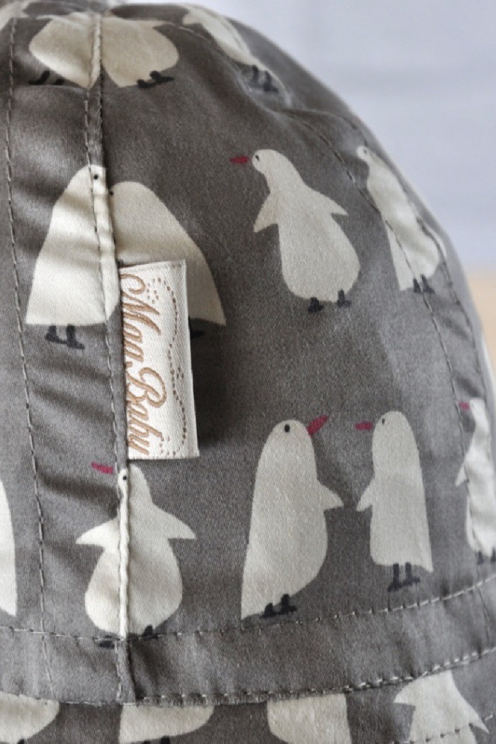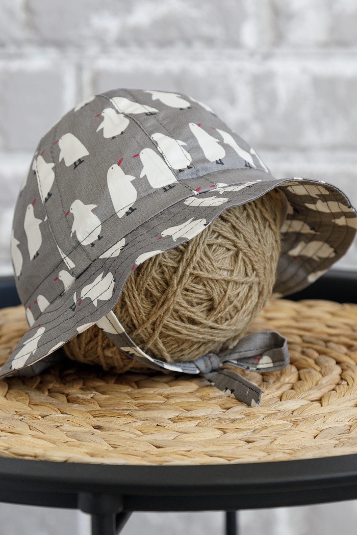 Панама на зав'язках виготовлена з тоненької бавовни - сатину. Гарно сідає по голівці. Поля зроблені без пластику та тугих елементів. Це дає можливість вигінати поля за вашим бажанням чи наявністю сонця. Шви всередині закриті.