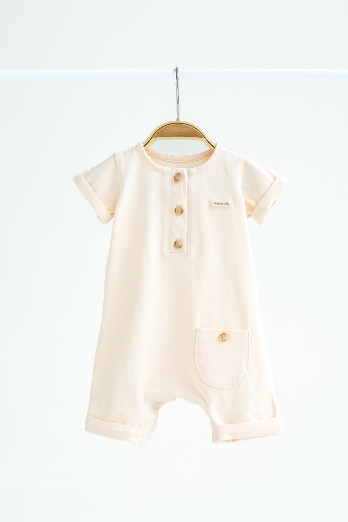 Модель с коротким рукавом. Благодаря пуговицам спереди удобно одевать песочник и не давить малышу на головку.