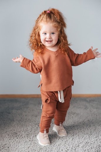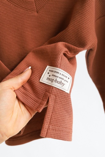 Кофта с длинным рукавом и V-образным вырезом изготовлена из хлопкового трикотажа двунитки с петлей, а брюки — из 100% хлопка с начесом. Ткань мягкая и приятная к телу, словно пушистые тучки. Подходит для чувствительной кожи – гипоаллергенна и позволяет коже дышать. Эластичный пояс штанов не тугой и не давить на животик.