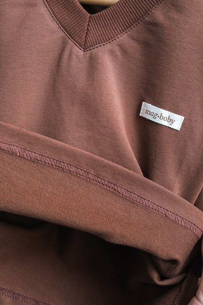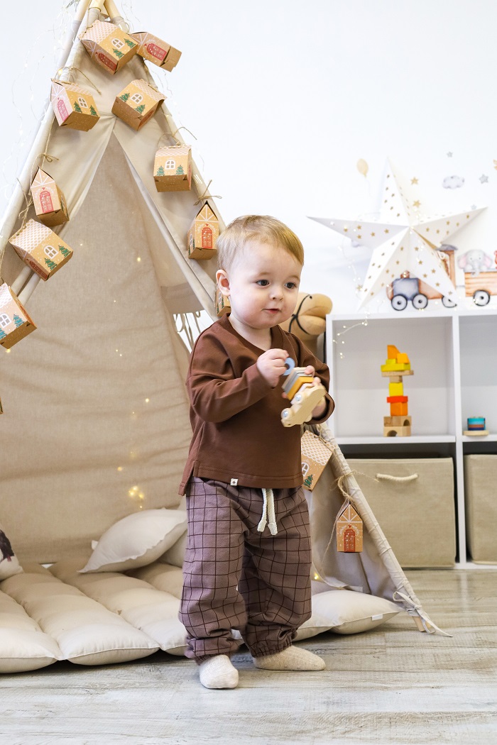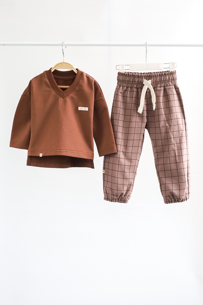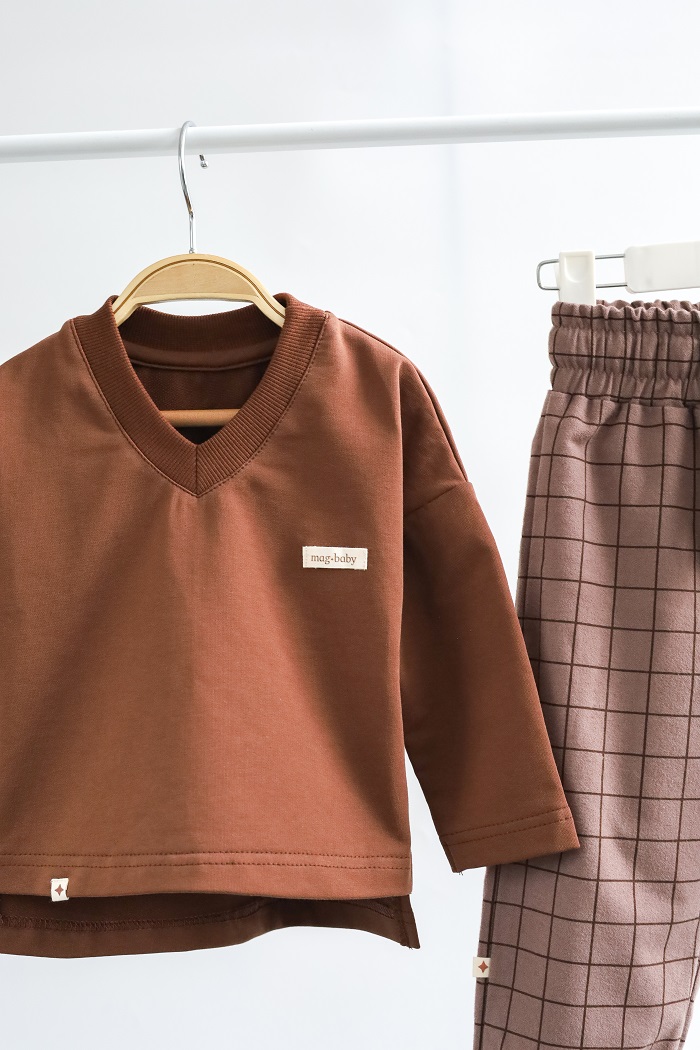 Кофта с длинным рукавом и V-образным вырезом изготовлена ​​из хлопкового трикотажа двунитки с петлей, а брюки — из 100% хлопка с начесом. Ткань мягкая и приятная к телу, словно пушистые тучки. Подходит для чувствительной кожи – гипоаллергенна и позволяет коже дышать. Эластичный пояс штанов не тугой и не давить на животик.