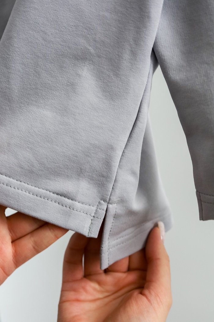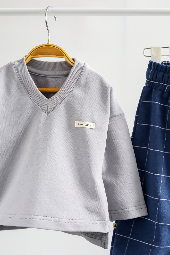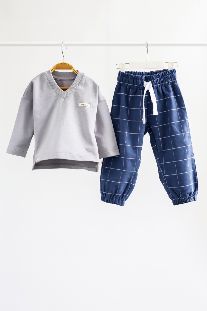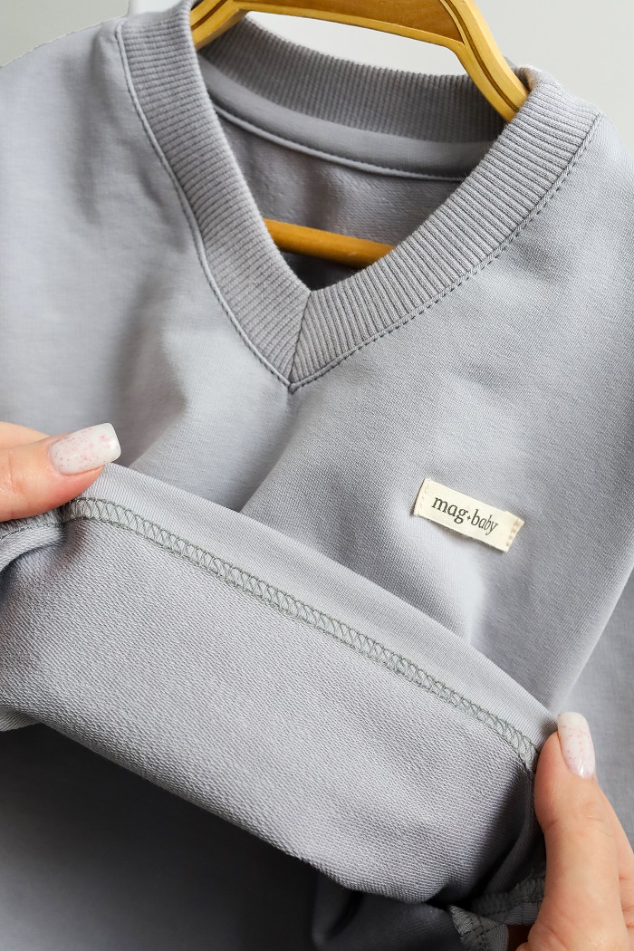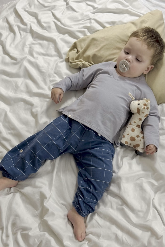 Кофта с длинным рукавом и V-образным вырезом изготовлена ​​из хлопкового трикотажа двунитки с петлей, а брюки — из 100% хлопка с начесом. Ткань мягкая и приятная к телу, словно пушистые тучки. Подходит для чувствительной кожи – гипоаллергенна и позволяет коже дышать. Эластичный пояс штанов не тугой и не давить на животик.