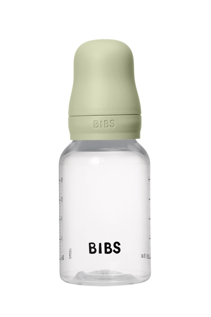 Пляшечка BIBS об’ємом 150 мл із соскою з натурального каучуку, з антиколіковою функцією.