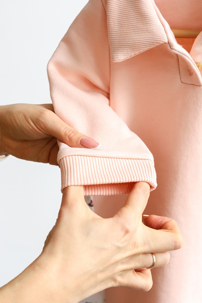 Платье комбинированное из разных материалов. Спереди похоже на платье-поло с воротничком на пуговицах и мягкими манжетами. Выполнено из нежного хлопкового трикотажа тринитки с петлей. Эластичный, мягкий на ощупь, пропускает воздух и не вызывает раздражение кожи.