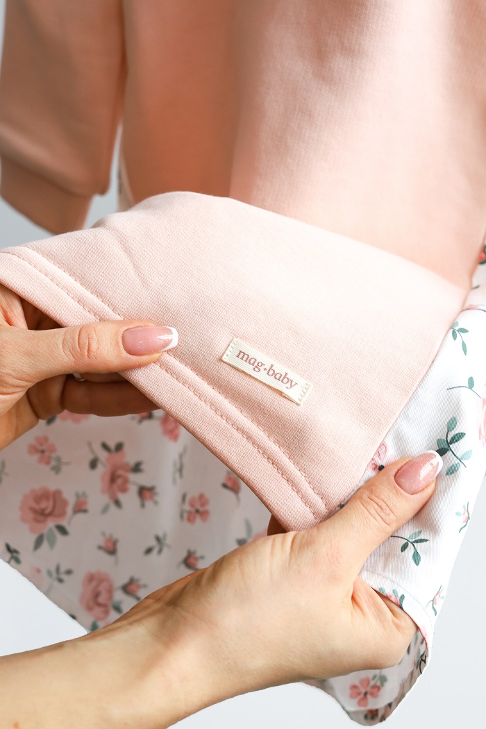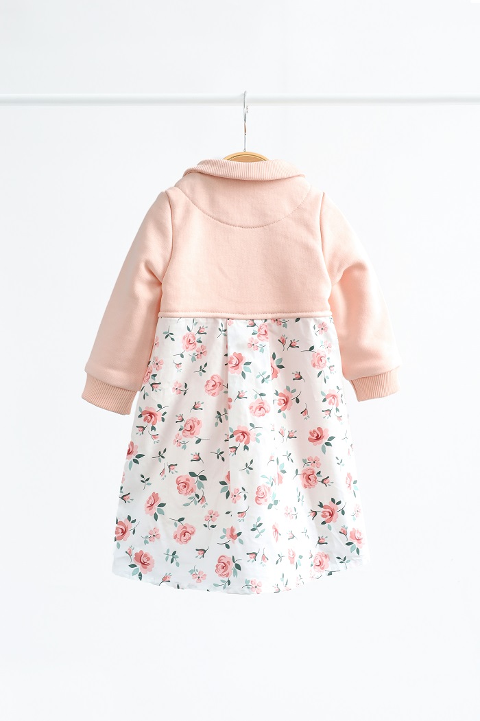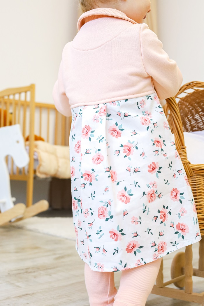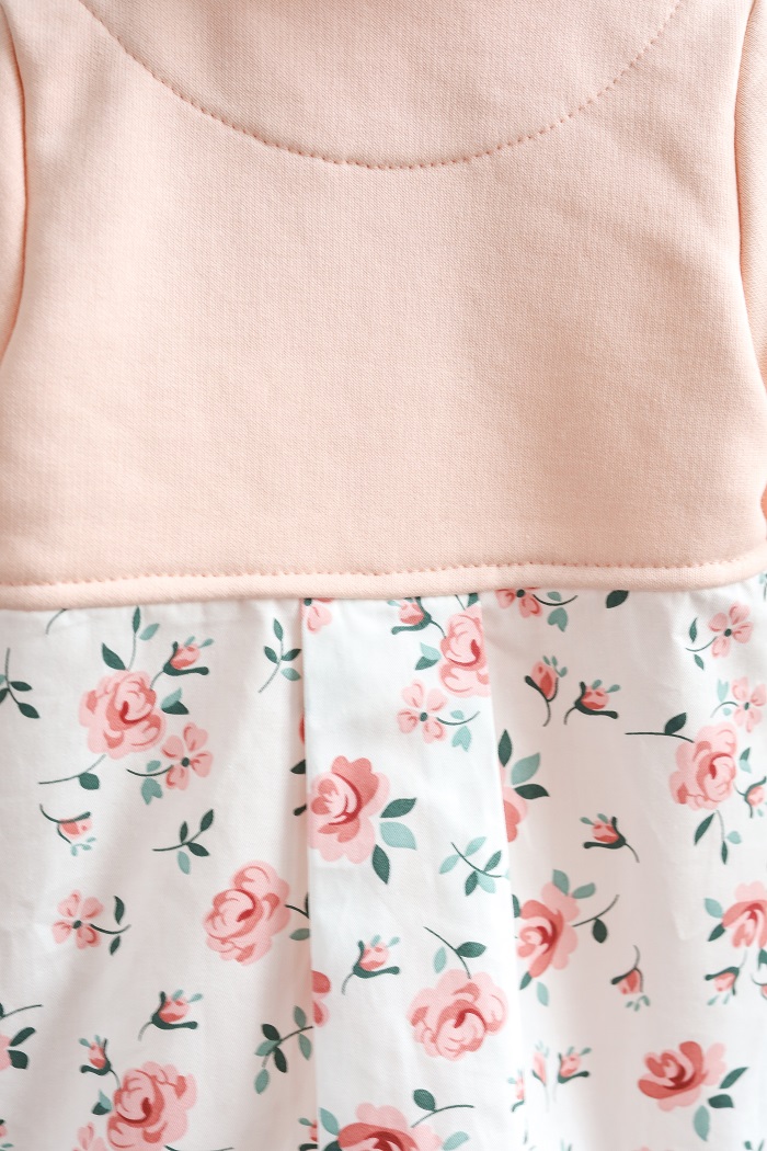 Сзади похоже на классическое платье. Спинка также трикотажная, а юбка из сатина – 100% натурального хлопка с нежным принтом. Сатин гипоаллергенен, хорошо впитывает влагу и позволяет коже дышать. Шелковистый на ощупь, нежный, гладкий и одновременно прочный и выдерживает частую стирку.
