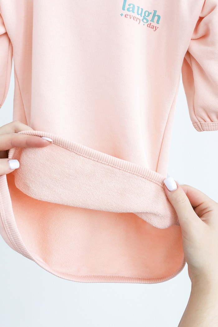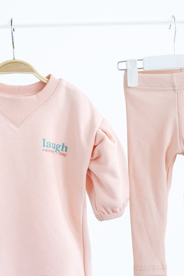 Платье пошито из эластичного, плотного и мягкого футера, с петлей внутри. Лосины – из нежного кашкорса. Ткани приятны к телу и хорошо пропускают воздух.