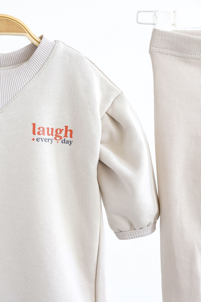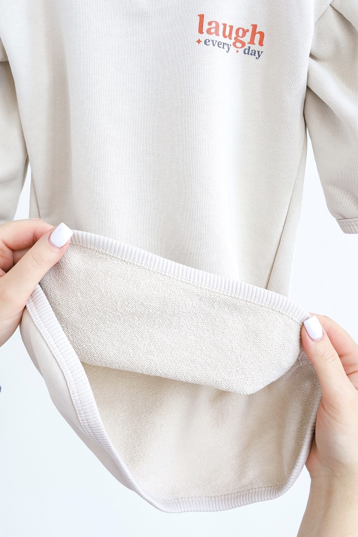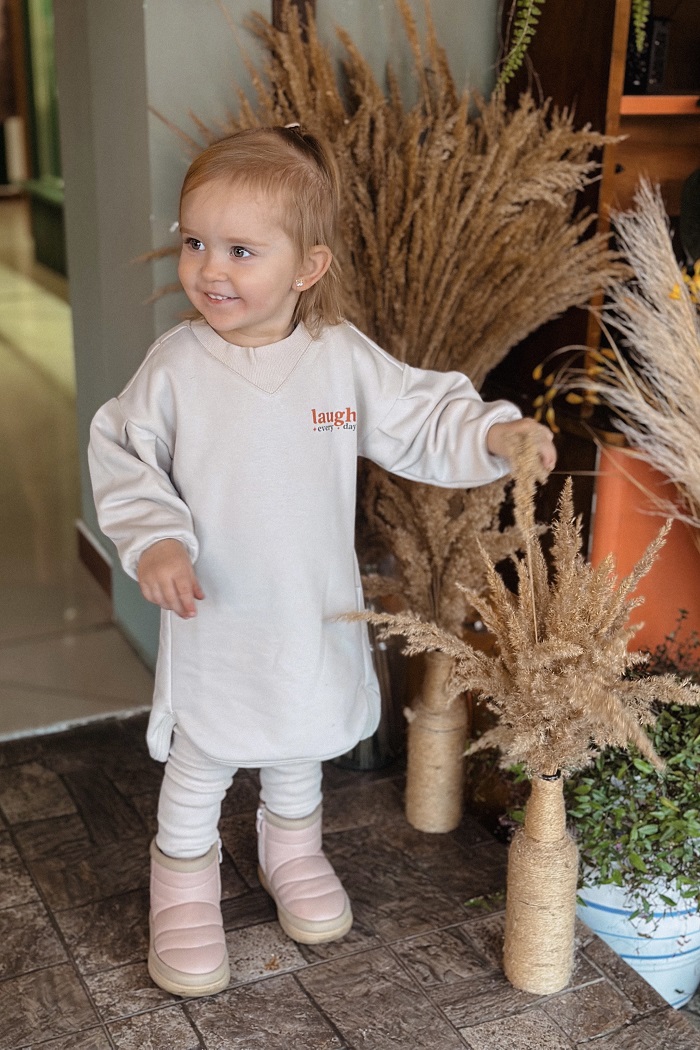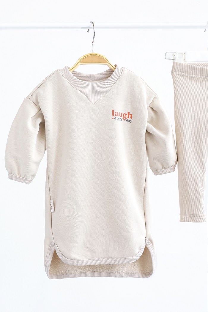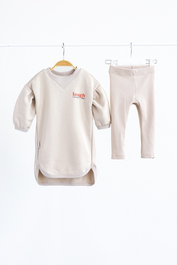 Платье пошито из эластичного, плотного и мягкого футера, с петлей внутри. Лосины – из нежного кашкорса. Ткани приятны к телу и хорошо пропускают воздух.