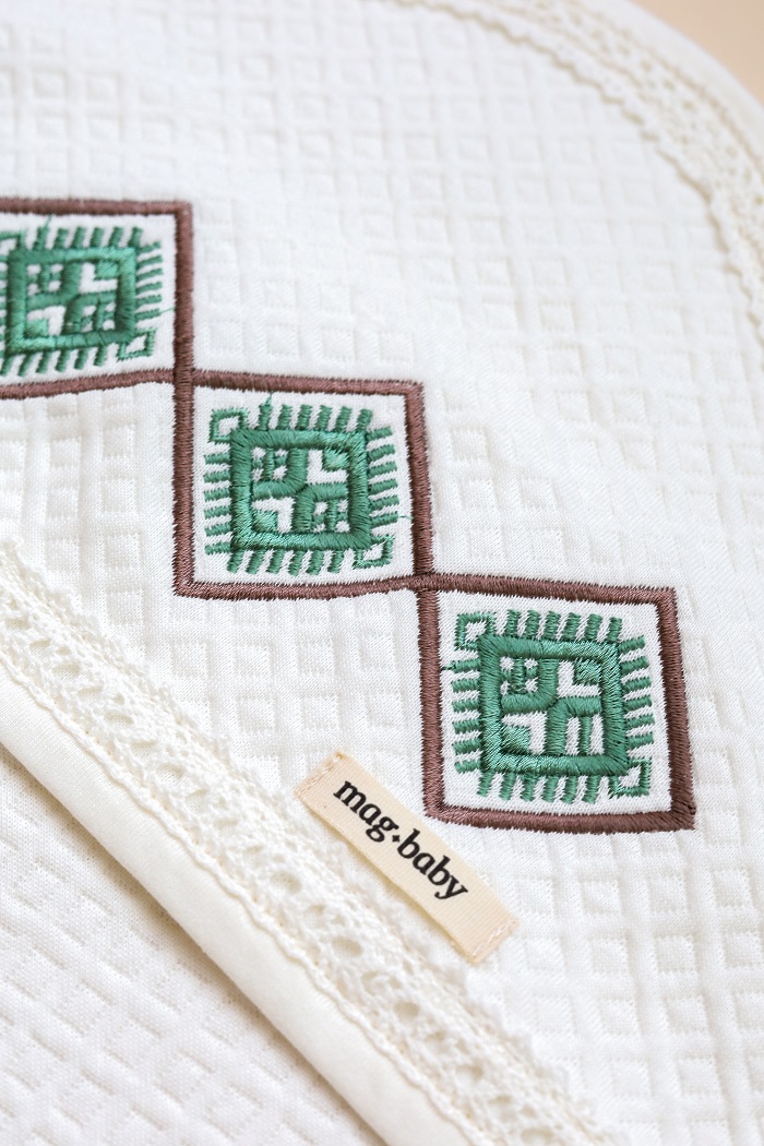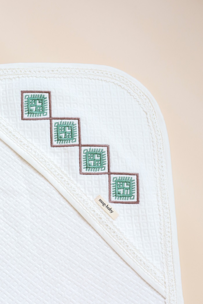 Изготовлен из капитоне. Это натуральный утепленный трехслойный трикотаж. Плотный, объемный и очень мягкий на ощупь. Он отлично согревает малыша, отлично поглощает влагу, потому отлично подойдет не только на выписку, но и в качестве крыжмы на крещение малыша.