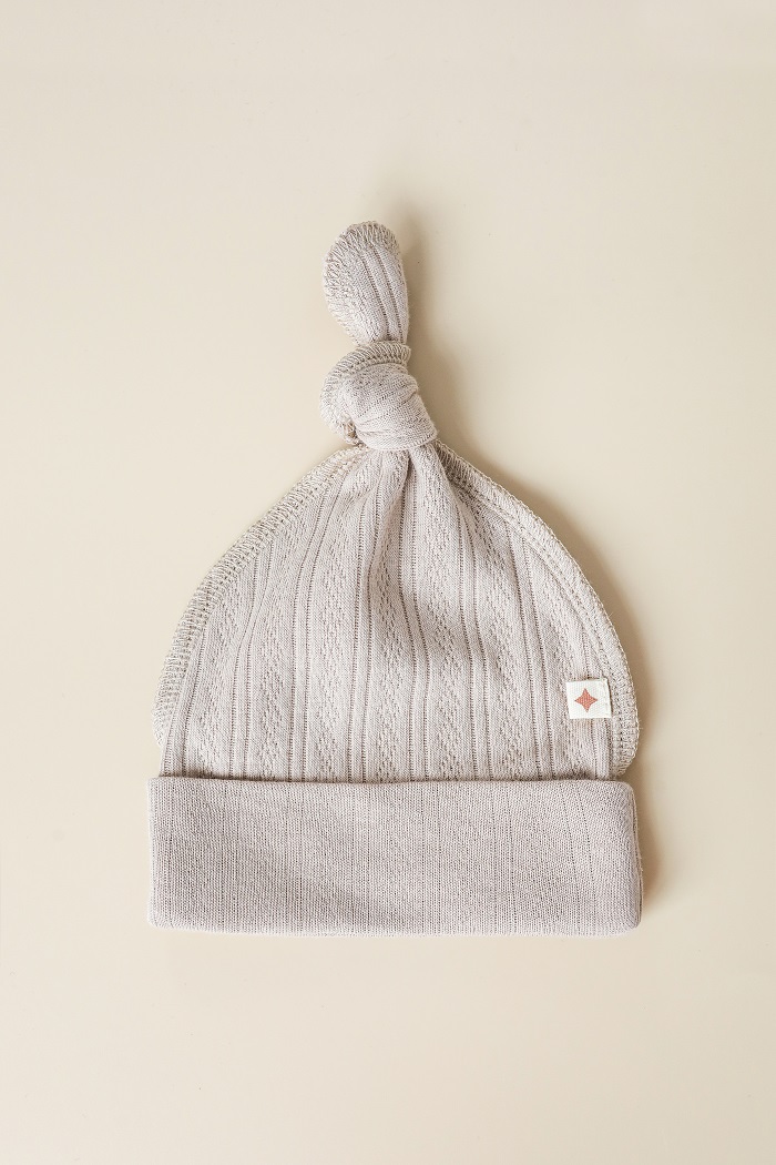 Шапочка Trudy пошита из перфорированного интерлочного трикотажа (100% хлопок). Ткань легкая, приятная к телу, хорошо пропускает воздух и не вызывает аллергии или раздражений. Ажурный узор делает её нежной и стильной, а узелок и минималистичная нашивка со звездочкой добавляют сказочности.