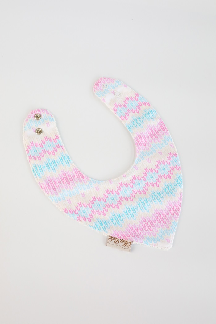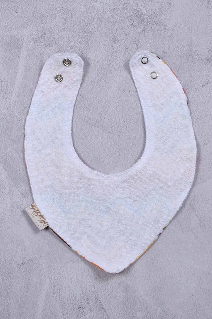 С обратной стороны на слюнявчике хлопковая махра, чтоб уж наверняка впитать все то, что на него попадает. Фурнитура безникелевая, фирмы YKК. Для удобства корректированная размера, на каждом слюнявчике имеется по 2 пары кнопок. И чтобы "слюнявчик сидел" он имеет специальную форму.