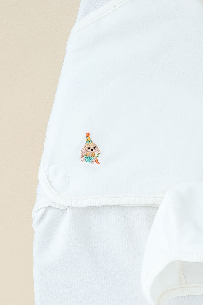 Вышивка на груди дарит немного сказки, а шапочка в комплекте завершает образ в тон.