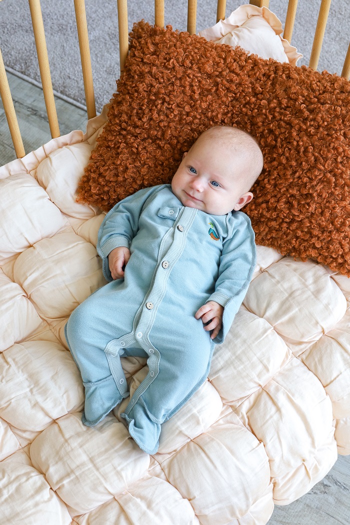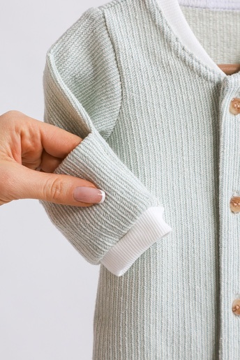 • Человечек застегивается на пуговицы, а между ножек — на кнопки, чтобы было удобно сменить подгузник. Кстати, кнопки изготовлены и сертифицированы в ЕС и не содержат никеля в составе.