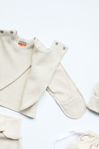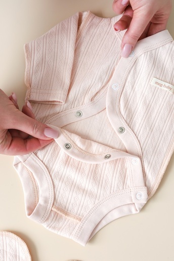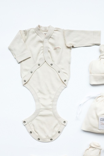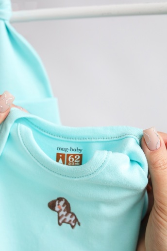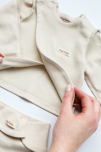 - 2 человечка: молочный и монохромный цветной. Молочный пошит из гладкого интерлока без начеса, а цветной — из двунитки, утепленный начесом изнутри. Все швы наружу, поэтому не будут раздражать и не натрут нежную кожу. Имеют отворотные царапки. Застегиваются на пуговицы, а между ножек на кнопки, чтобы было удобно сменить подгузник. Человечки имеют держатель на кнопке для пустышки или игрушки. При необходимости туда можно прицепить комфортер или грызунок. Все застежки из европейской фурнитуры, которая не содержит никеля и не вызывает раздражения.