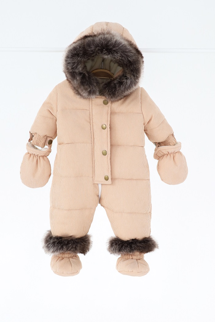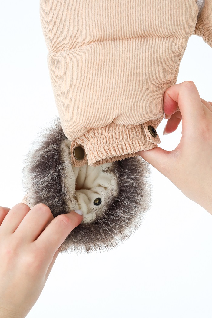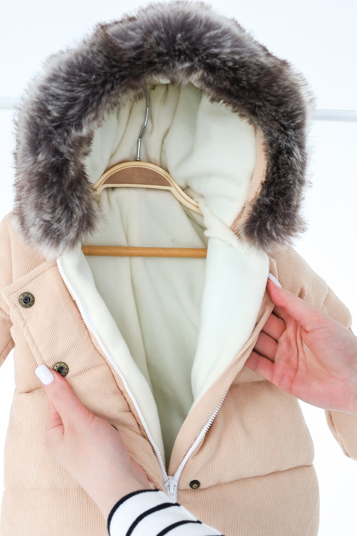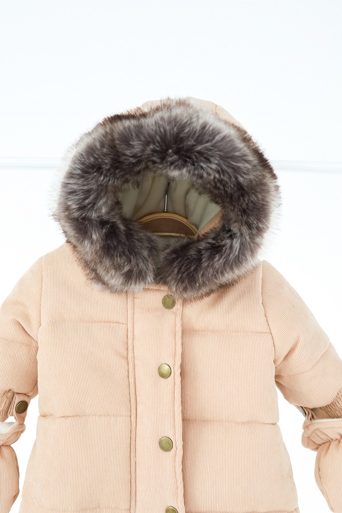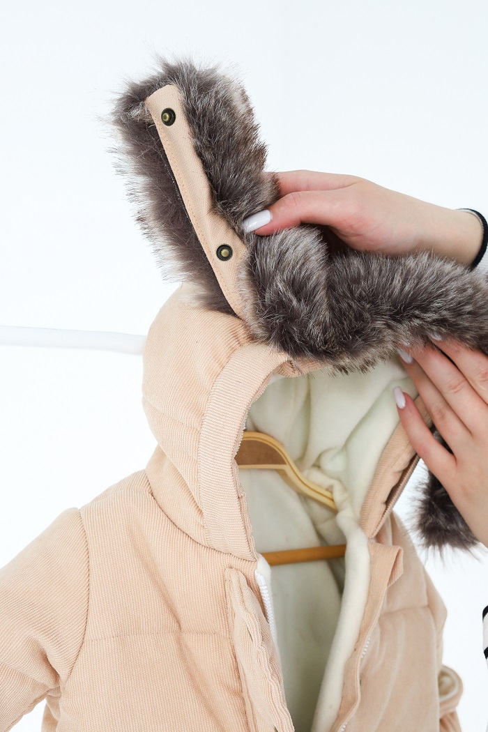 Снаружи он выполнен из вельвета и имеет отделку из искусственного меха, который отстегивается в капюшоне.