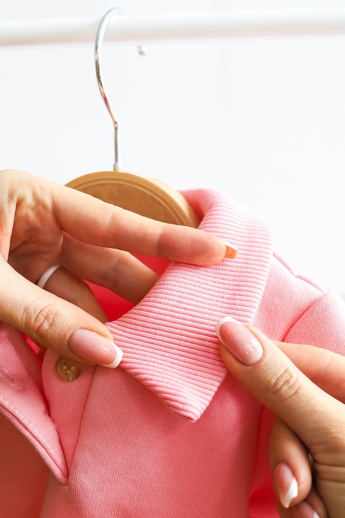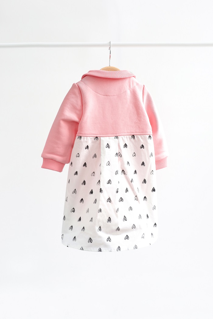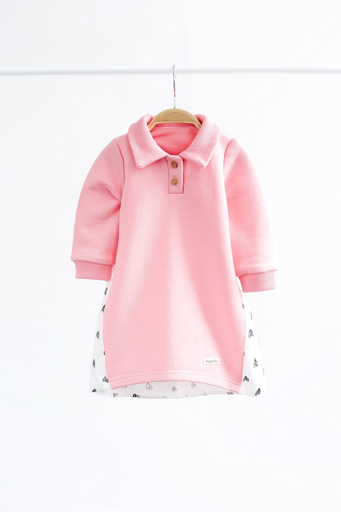 Сукня комбінована з різних матеріалів. Спереду схожа на сукню-поло з комірцем на ґудзиках та м’якими манжетами. Виконана з ніжного бавовняного трикотажу тринитки з петлею. Еластичний, м’який на дотик, пропускає повітря і не спричиняє подразнення шкіри.