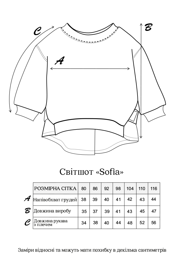 Комфортний, як звичайний світшот, і гарний акцент повсякденних луків водночас. Пасує до штанів, лосин і спідниць. Підходить для садочка, легких прогулянок і, звісно, чарівних фотосесій!