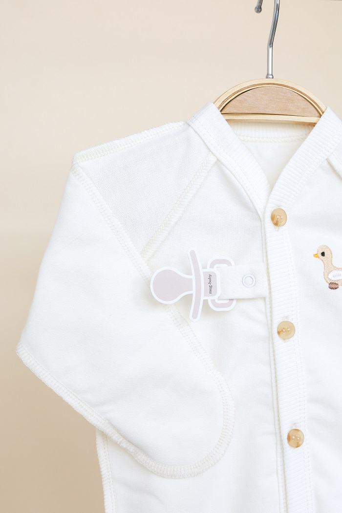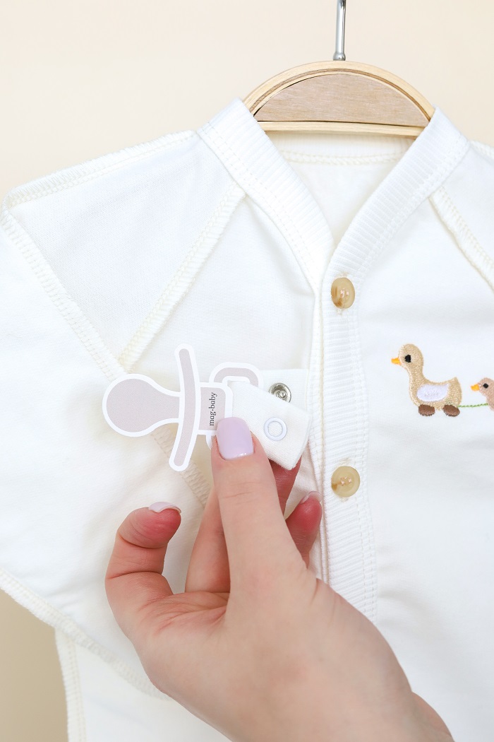 • Між 1 і 2 ґудзиком є тримач для пустушки на кнопці, що дуже зручно. Завдяки цьому можна обійтися без зайвих прибамбасів — під час сну вони не заважатимуть і пустушка не загубиться.