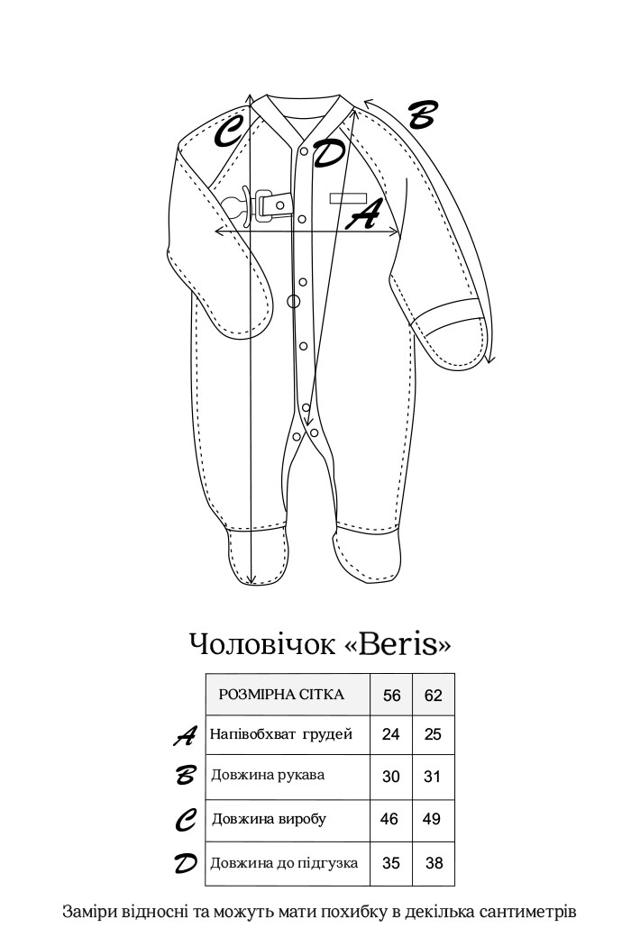 • В розмірах 56, 62 є відворотні царапки, а всі шви зовнішні, щоб не подразнювати ніжну шкіру малюка.
