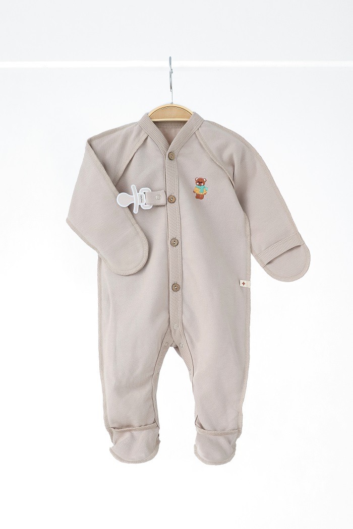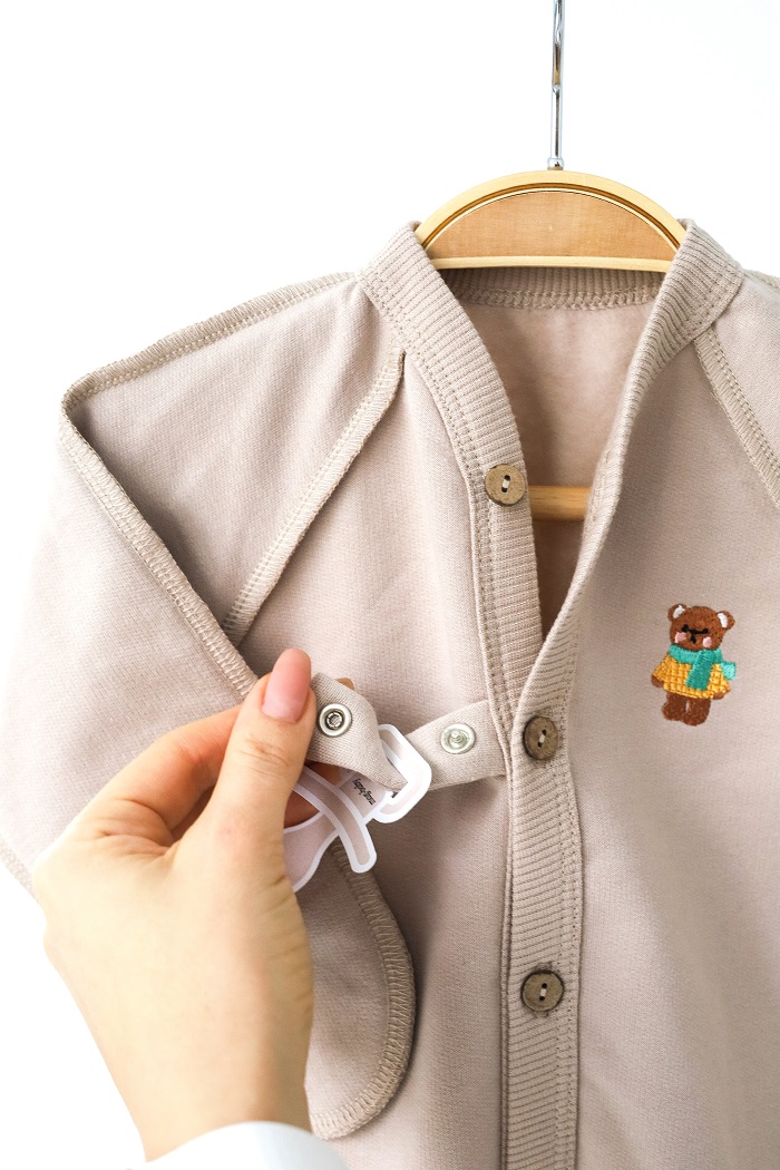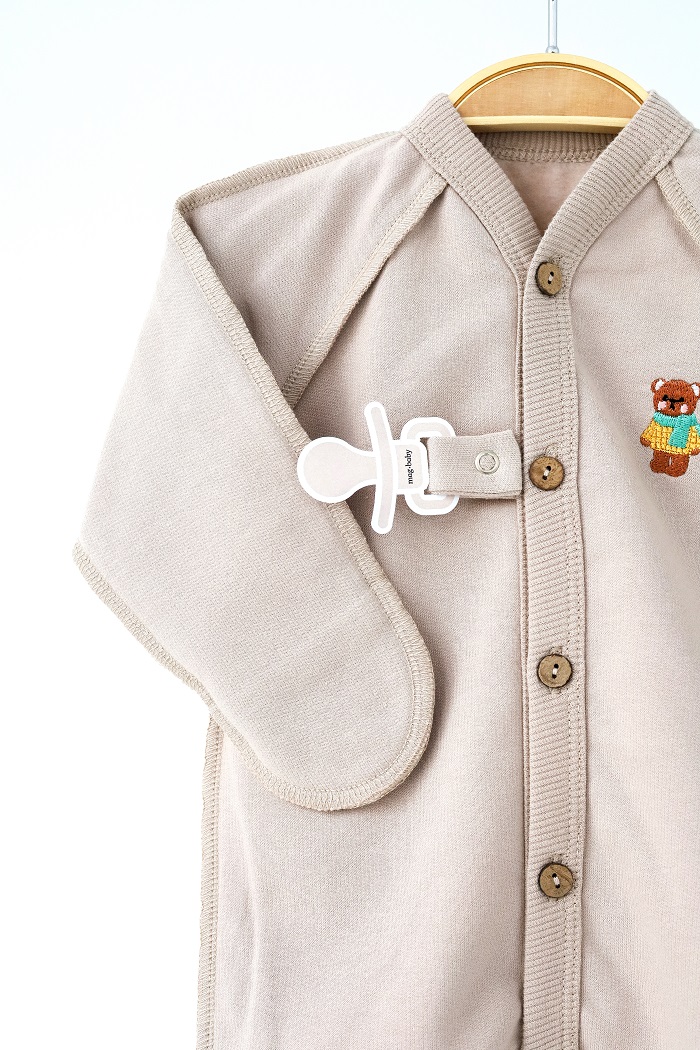 • Між 1 і 2 ґудзиком є тримач для пустушки на кнопці, що дуже зручно. Завдяки цьому можна обійтися без зайвих прибамбасів — під час сну вони не заважатимуть і пустушка не загубиться.
