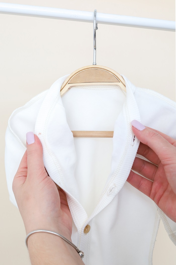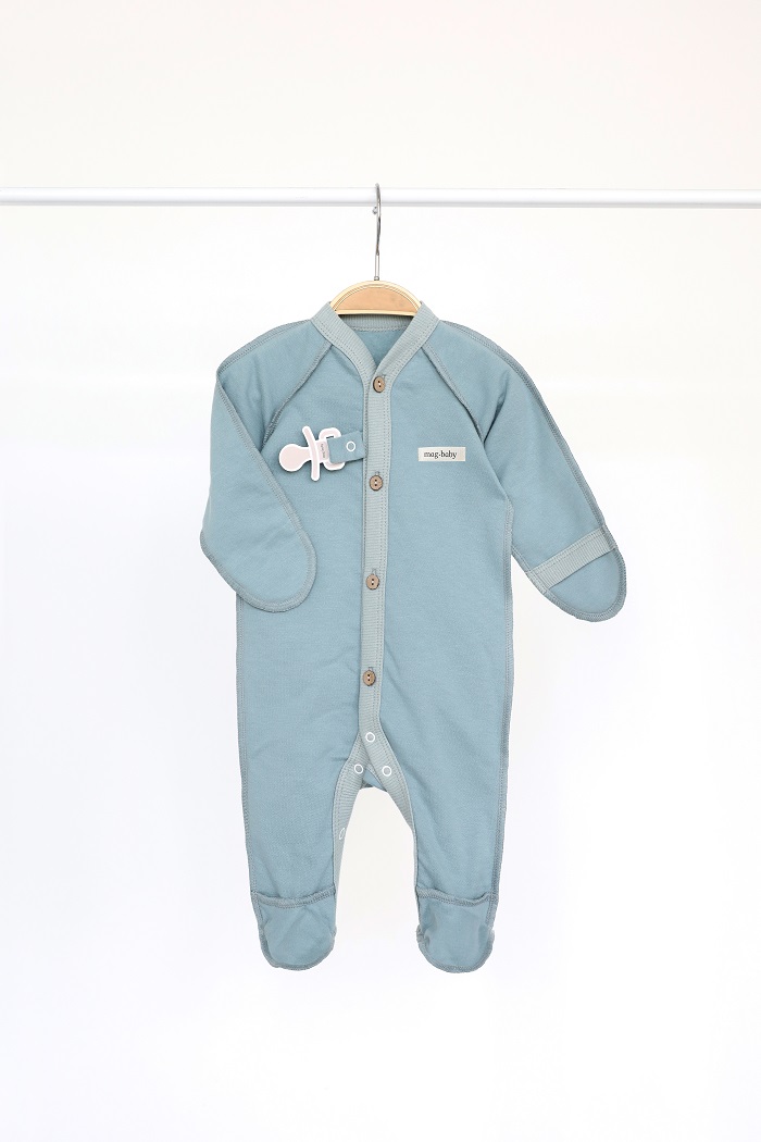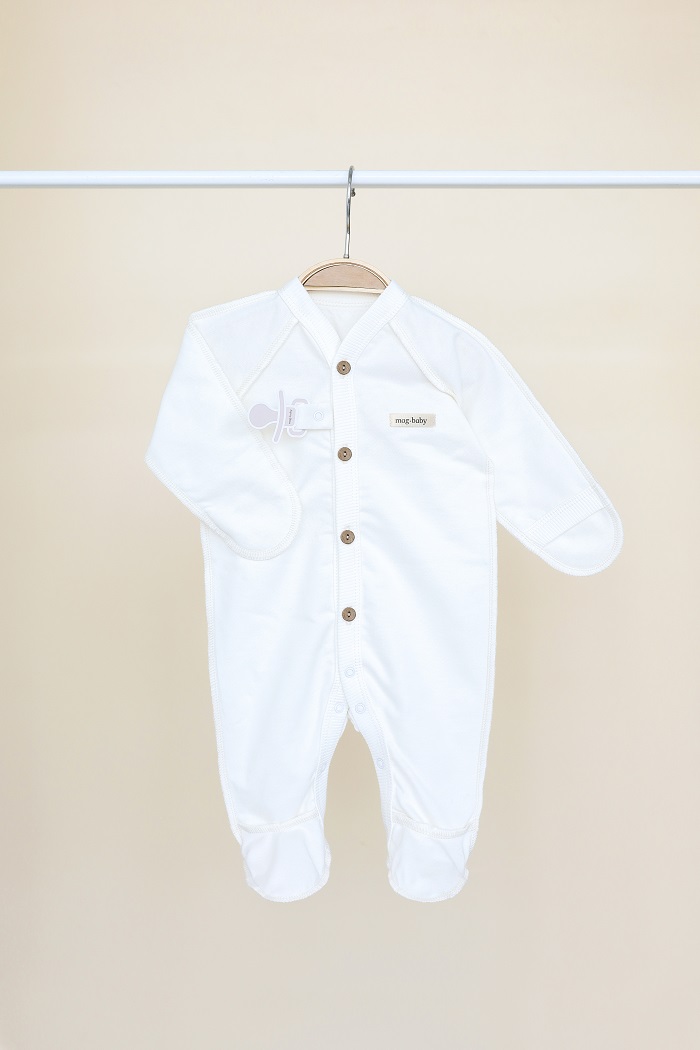 • 2 чоловічки: молочний та монохромний кольоровий. Молочний пошитий з гладенького інтерлоку без начосу, а кольоровий — з двунитки, утеплений начосом зсередини. Всі шви назовні, тому не подразнюватимуть і не натиратимуть ніжну шкіру. Мають відворотні царапки. Застібаються на ґудзики, а між ніжок на кнопки, щоб було зручно змінити підгузок. Чоловічки мають тримач на кнопці для пустушки або іграшки. За потреби туди можна причепити комфортер або гризунець. Всі застібки з європейської фурнітури, яка не має у складі нікелю та не спричиняє подразнення.