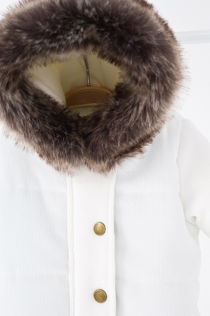 Зовні він виконаний з вельвету і має оздоблення зі штучного хутра, яке відстібається в капюшоні.