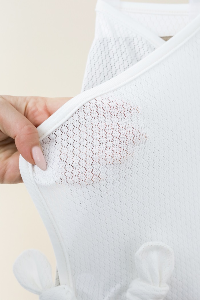 Модель виконана з трикотажу трансферлі — легкої ажурної тканини з делікатним візерунком з дірочок. Такий матеріал добре пропускає повітря, дозволяє шкірі дихати і підходить для щоденного використання, зокрема в теплу пору року.