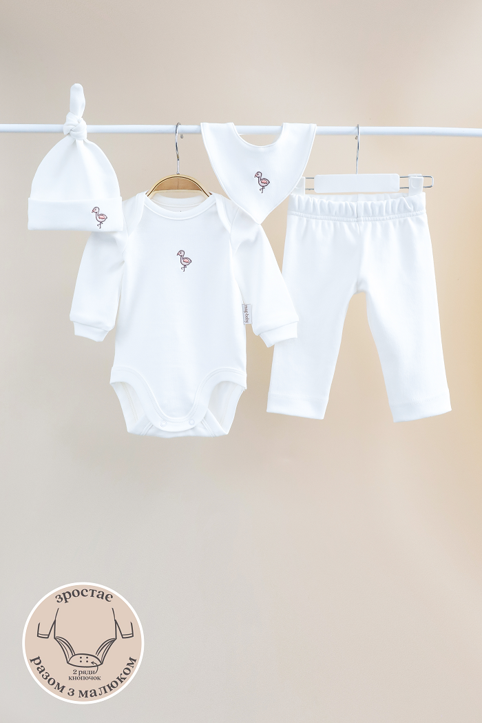 Набір містить: боді, штани, слинявчик, шапочку в одному кольорі.