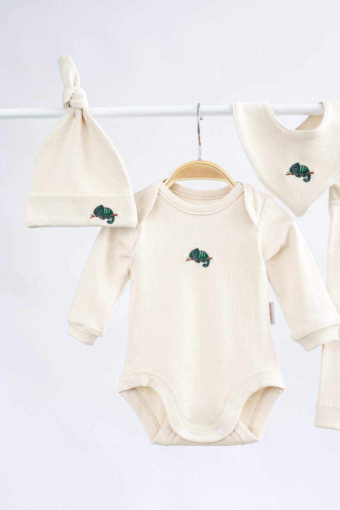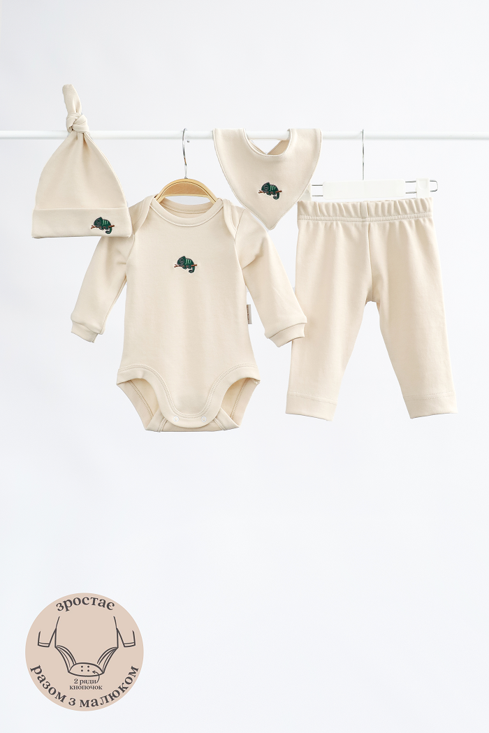 Набір містить: боді, штани, слинявчик, шапочку в одному кольорі.