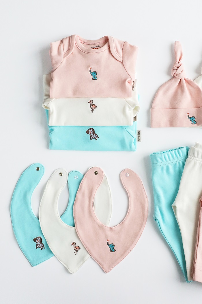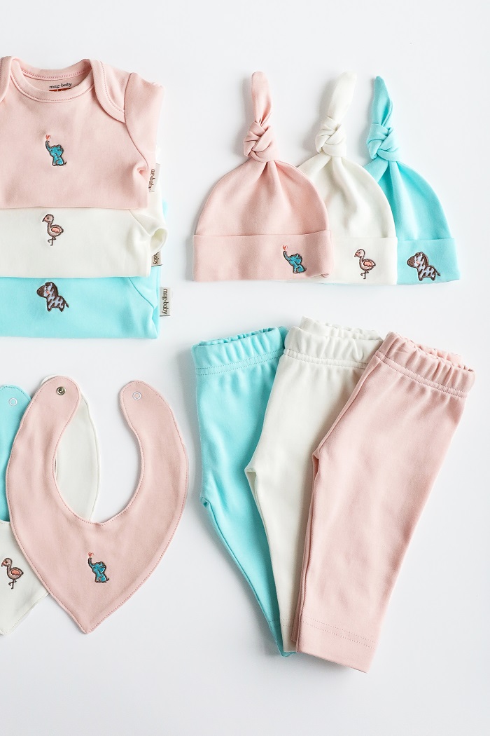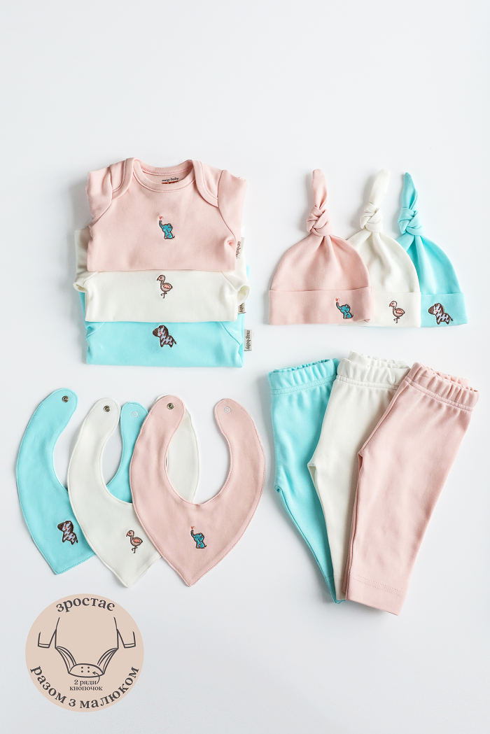 Набір містить: бодіки, штани, слинявчики, шапочки в 3-х гармонійних кольорах.